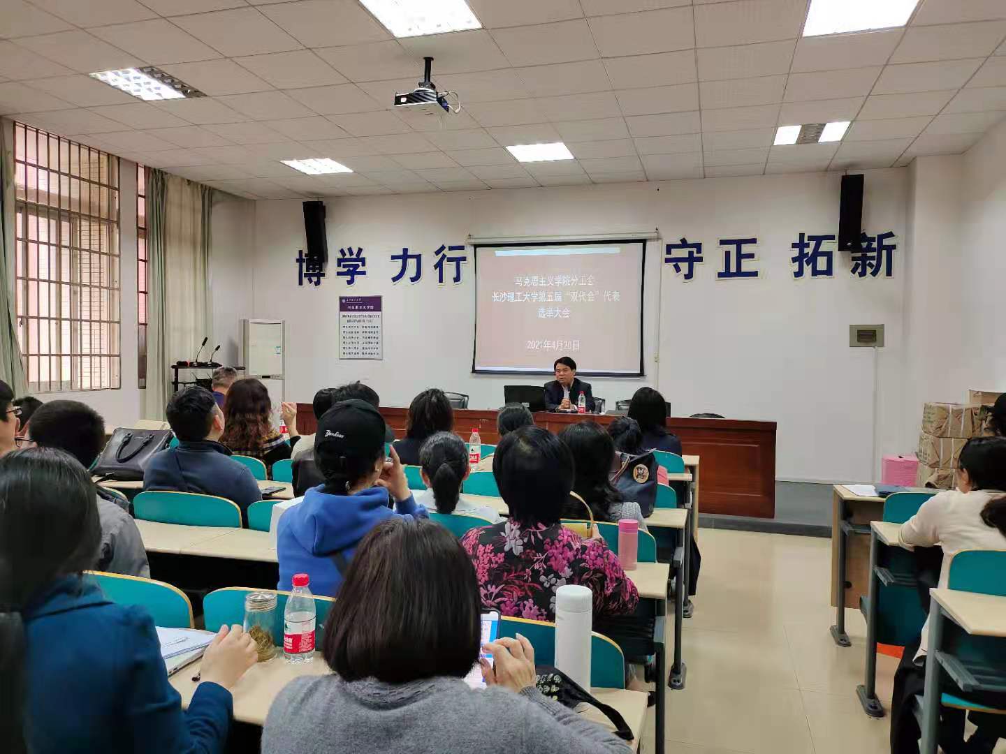 2021年4月20日下午3点,校党委副书记蒋昌波在云塘校区文科楼为马克思主义学院全体教职工宣讲学校第四次党代会精神,并出席学校第五次“双代会”马克思主义学院分工会代表选举大会。大会由学院党委书记易显飞教授主持,学院教职工暨工会会员60余人参加大会。