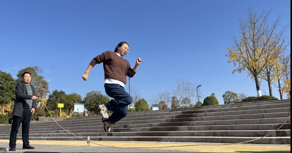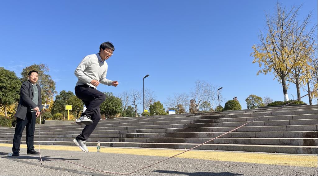 跳长绳比赛在湖畔广场率先点燃活动激情。各工会小组组成参赛队伍集团作战,参照校运会比赛规则,以2分钟全队跳过的人次数总和为比赛成绩。各组队员紧张有序,首尾相连,鱼贯而入,依次跳跃,充分展现了高度的集体荣誉感和团队协作精神。广大观众既为配合默契、无缝衔接、姿势优美的队员鼓掌欢呼,也给予紧张退避、踩错节奏的队员加油鼓劲。队员们竭尽全力,观众和队友们时而赞叹,时而惋惜,比赛活动竞争激烈又温情四溢。经过紧张热烈的比赛,最终第三工会小组(德法概论组)获得第一名,第二工会小组(纲要概论组)获得第二名,第一工会小组(原理行政组)屈居第三名。