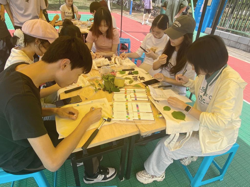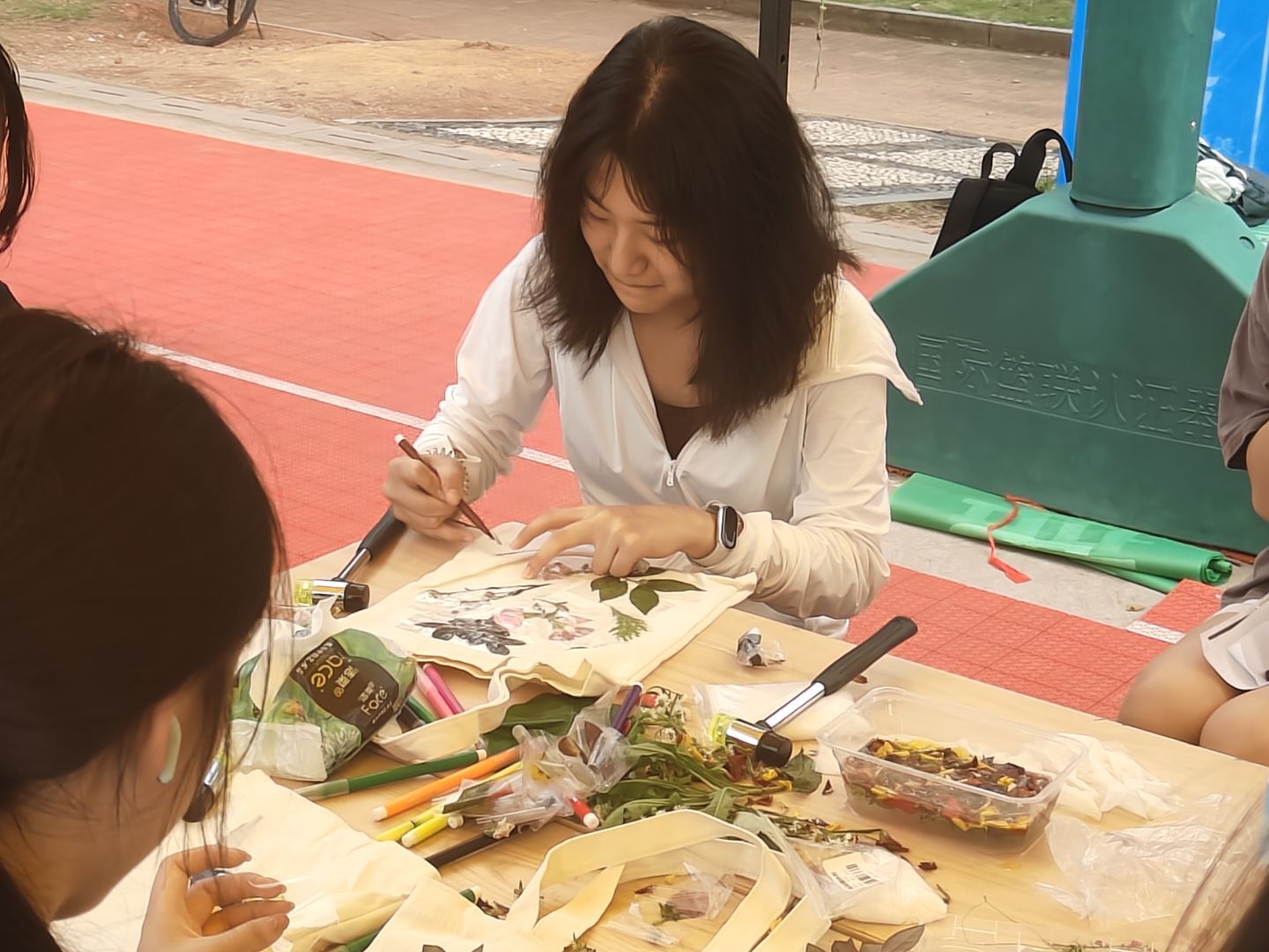 活动伊始,工作人员准备了各色新鲜花草、空白帆布包等工具,并为大家讲解了花草拓印的步骤与技巧。活动中同学们挑选心仪的花草,将玫瑰、雏菊、绿叶等巧妙组合,设计出独特的图案,固定在帆布包上。过程中,同学们相互交流创作思路,分享制作经验。本次活动旨在通过手工创作帮助大家舒缓情绪,感受自然之美与艺术魅力。
