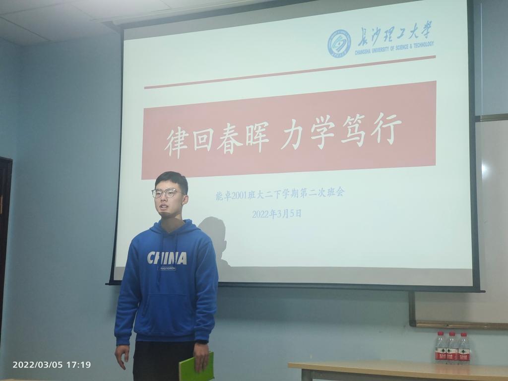 本次班会以“律回春晖,力学笃行”为主题,学生会主席宝思宇和能卓班户宏骏主持开场,阐述班会的主题和目的。首先由张晓烽发表讲话,希望同学们学会自主学习,让优秀成为习惯,培养团队协作意识,提升集体荣誉感,思考木桶短板原理,体现大格局思想。