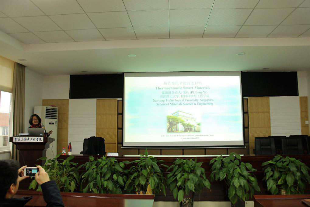 受聘仪式结束后,龙祎教授作了一场题为“Progress in Thermochromic Materials”的学术报告,龙教授首先从无机VO2的晶型相变、有机水凝胶的相分离、主动控制技术等内容介绍了热致变色玻璃窗节能的原理;在水凝胶热致变色玻璃窗结构方面,龙教授分享了她团队所做的水凝胶-二氧化钒的混合体系;最后,龙教授详细介绍了力热双响应的主动控制技术并提出了热致变色玻璃窗未来的研究方向。