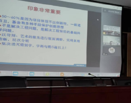 邵教授从“立项依据”评审关注点、“立项依据”实例、“研究内容”评审关注点、“研究方案”评审关注点、“技术方案可行性”评审关注点、“研究基础、创新点与摘要”等6个方面做了精彩的讲解,结合实例全要素地剖析了基金申报的注意事项和写作原则,尤其在报告的最后强调了创新的重要性,指出50%~60%基金申报失败的原因就在于项目体现不出创新性,一新遮百丑,基金有很多种手段保护创新思想,科研研究要解决工程背后的基础科学问题。撰写基金本子时要以苛刻、艺术的眼光进行版面调整,实现条理清晰,层次分明,更要坚决消灭错别字,字斟句酌5遍以上。邵教授的报告让在场的师生们深受启发,受到了现场的一致好评,也激起了交流讨论的热潮。