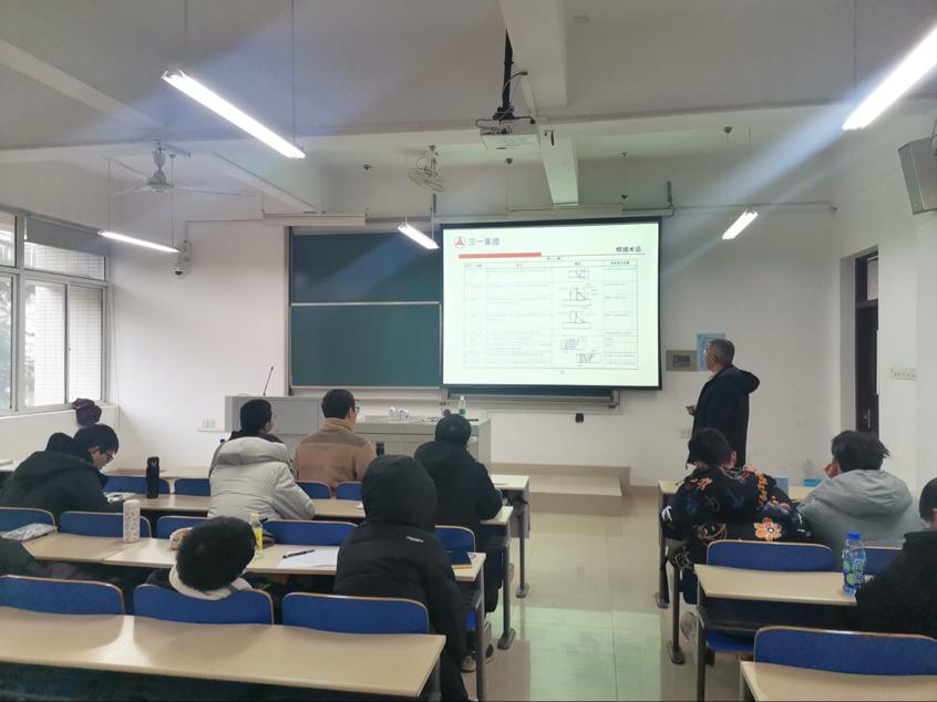 2020年12月15日下午14:00,在MG冰球突破官网云塘校区工科一号楼B213开展了三一集团与MG冰球突破官网校企联培智造班教学第七课:八大工艺类基础课程——焊装,本次教学课程由三一集团泵送事业部泵送公司工艺所一级工程师黄清平老师主讲,黄清平老师有多年工艺及实操经验,为大家带来了一堂扎实丰富的焊装基础课程。