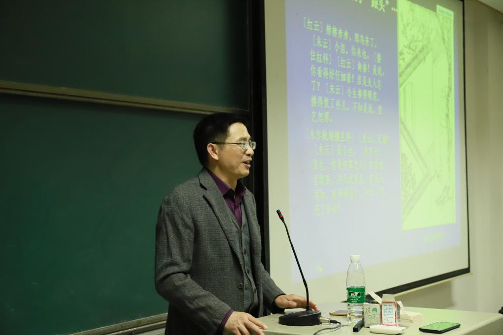 讲座伊始,郑教授便直入主题,和同学们分析了《西厢记》在中国文学史上的重要地位,引起了同学们对《西厢记》的兴趣,在现场询问到同学们对于《西厢记》这一国学著作了解甚少后,他提出在当今应试教育,新时代大学生应该更多的关注国学原典,以此来提升自己的文学素养。