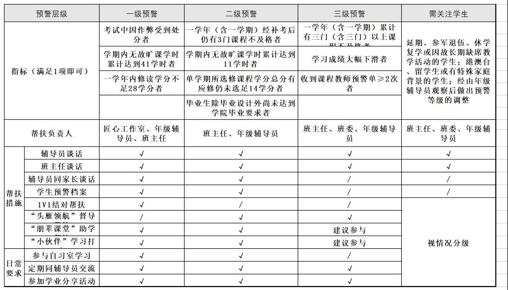 图1:汽机学院学业分级预警体系 二是聚焦学生学业需求,系统设计学业帮扶体系。针对部分课程学习难度大、部分学生学业发展困难的实际,结合教育学、心理学和管理学等专业知识,统筹规划,设计“学业适应-学业促进-学业提升-学业发展-学业咨询”五位一体的学业指导与服务体系,整体推进帮助学生解决学业困难。建立学业支持服务志愿认定及认证管理体系,探索构建学业帮扶评价标准和反馈机制。