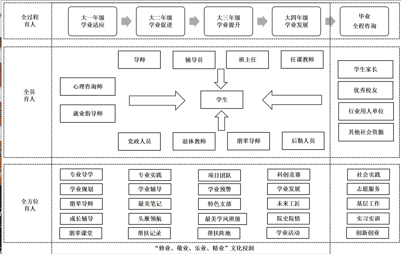 图二:“三全育人”视域下学业指导与服务体系 三是聚焦学生学业发展,全面提升学业服务水平。挖掘社会资源,在语言学习、考研升学、就业创业等环节开展进行专业化指导;制定学业帮扶服务标准,明确细化帮扶课程、朋辈导师、专业教师等学业支持的任务分工;定期组织学业支持专题调研,梳理学业帮扶中的有效工具和举措,推进学业服务工作专业化,提升帮扶实效。 (三)突出针对性,推进学业指导与服务的精准化 一是立足特殊群体,提前介入。根据各专业课程设置特点,将朋辈导师分为数理组、语言组、科创组等不同小组,针对性地招募朋辈导师。根据不同年级需求,开展定制化朋辈课堂。针对少数民族学生、农村专项计划学生等群体,探寻学生学习规律特点,细分重要学习时间节点,设计针对性强的学业指导项目,开展全过程追踪式学业辅导。 二是立足关键节点,主动作为。坚持直击痛点反馈教学,以激励学生自发参与学业指导活动为契机,在关键节点深入了解学生关注的热点难点问题,第一时间向专业教师反馈,支持专业教师不断调整和改进教学。定期与数理基础课、语言文化课、专业基础课等课程负责人深入研讨如何配合教学改革和调整同步改进“匠心答疑坊”、朋辈课堂等学业支持项目,使“匠心工作室”对课内教学形成有效的助力,推动两个课堂同频共振。 三是立足重点课程,针对辅导。针对学生学习挑战较大的17门课程,根据课程学习进度开设系列辅导课程,梳理课程核心知识点,共享课程学业辅导教案,协助制定考前复习计划。根据学生实际需求,进行课程考点串讲,对补考学生进行针对性的精准辅导,针对重修学生联合专业教师,制定一对一重修帮扶计划,实现学业帮扶全程不断线。 (四)突出时代性,推进学业指导与服务的网络化 一是创新学业指导与服务载体。利用“匠心学堂”小程序,深入探索适应新时代大学生特点的学业支持方式。依托朋辈力量,共享答疑“经验帖”等线上资源,探索录制知识点讲解短视频,在同学们喜爱的网络平台上广泛分享,不断挖掘学业指导与服务的新载体。 二是举办形式活泼的学业支持活动。依托易班、微信公众号等平台,定期开展知识难点短视频大赛、十佳学业导师评选、百篇学霸笔记评选等特色学业支持活动,打造精品朋辈课堂与金牌朋辈学业导师。 三是打造学业帮扶精品课程。依托专业教师力量,推出专业认知系列微课,积极录制《大学生新生适应指南》等线上微课。在积累学生学业服务个案的基础上,尝试应用和总结国内外前沿咨询工具,总结对解决地方高校学生的学业困惑确有实效的工具,并广泛推广和运用到学生的学业咨询中。 |