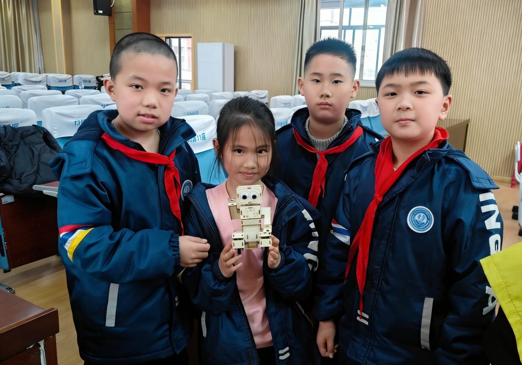 在动手实践环节,大学生志愿者们化身“AI小导师”,手把手指导小学生完成声控机器人的拼装。当亲手制作的机器人在语音指令下顺利启动时,课堂再次沸腾,一张张童真的脸上满是对科学探索的热爱与对未来科技的憧憬。