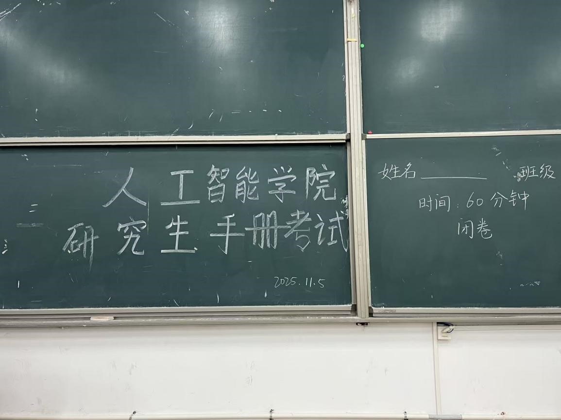 11月5日,人工智能学院2025级研究生新生《研究生手册》考试于工科一号楼A208考场举行。本次考试由研究生会骨干成员承担监考工作,采取闭卷形式进行。