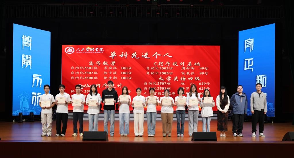 随后大会对先进班集体和先进个人进行表彰。其中,自动化2506班、自动化2503班、机器人2502班获评“学期先进班集体”,23名同学荣获“学习先进个人”称号,12名同学荣获“单科先进个人”称号,激励同学们奋勇争先,共同进步。