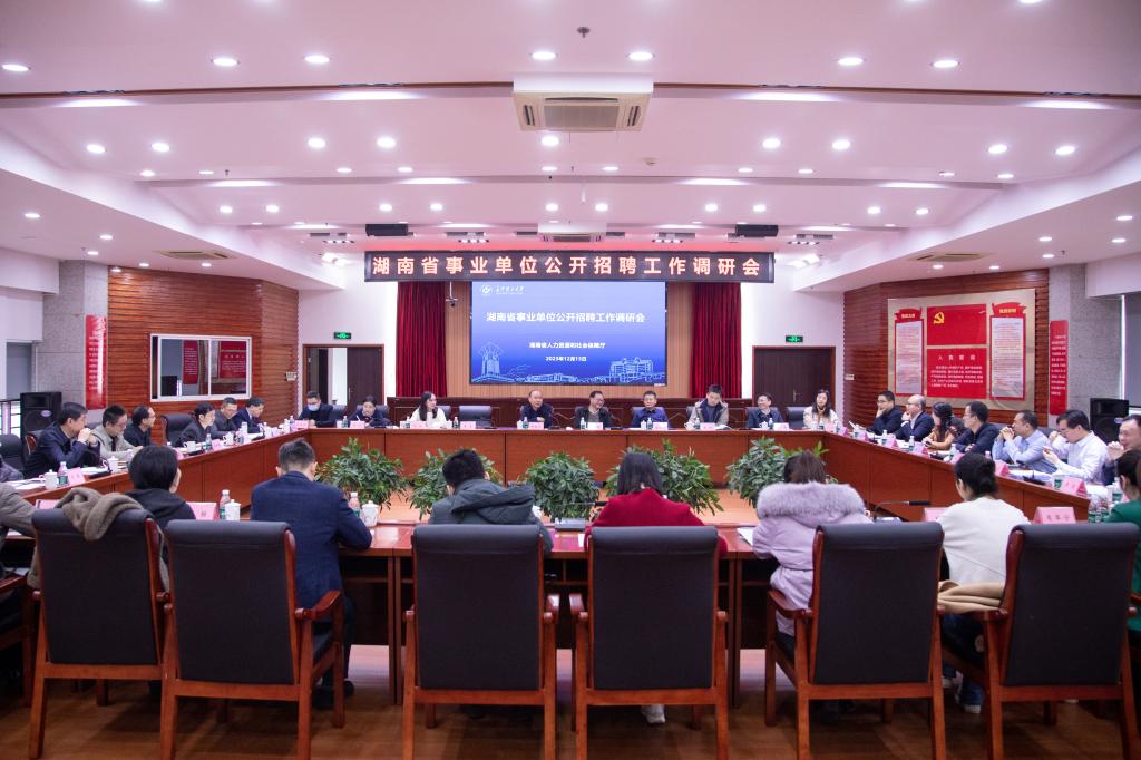 12月13日上午,湖南省事业单位公开招聘工作调研会在MG冰球官网云塘校区一办九楼会议室召开,省人社厅二级巡视员钟吉元、MG冰球突破官网副校长刘朝晖,省内26家事业单位人事处负责人和业务骨干参加调研会。