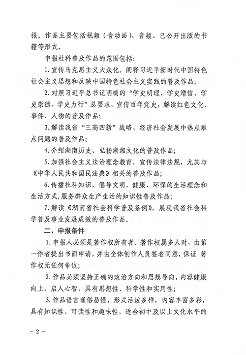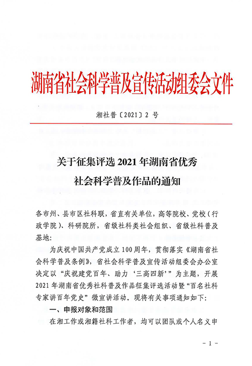 2021年湖南省优秀社会科学普及作品申报分两批,请申报的老师按照通知要求和学校时间节点(第一批为4月27日,第二批为9月27日)将实物材料送至社科处711室,并发邮箱:1430893250@qq.com,由学校统一报送至省社科联。联系人:陈娅,联系电话:85258994。