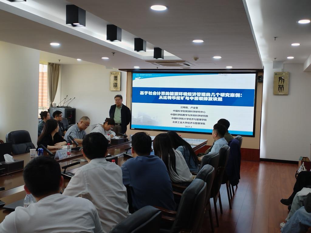 4月15日,MG冰球突破官网“学科交叉与创新发展”系列讲座第1期成功举办。发展中国家科学院院士、国际系统与控制科学院院士、中国科学院杰出研究员汪寿阳作“基于社会计算的能源环境经济管理的几个研究案例:从比特币挖矿与中国碳排放谈起”主题报告,同时邀请北京工业大学经济与管理学院青年教师卢全莹教授进行分享。讲座由社科处处长刘坚教授主持,各学院教师代表50余人聆听讲座。