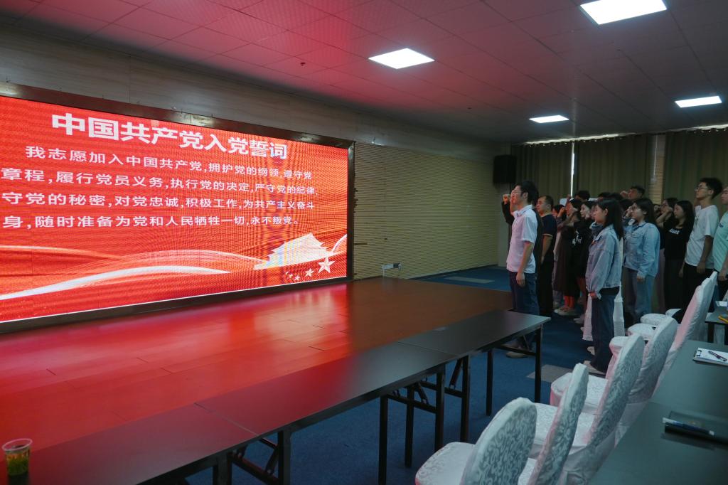 “我志愿加入中国共产党……随时准备为党和人民牺牲一切,永不叛党。”现场师生党员在张伟的带领下,面对鲜红的党旗,共同高举右拳,一起重温入党誓词。现场宣誓铿锵有力,表达了师生党员们对党的赤诚忠心和为共产主义奋斗终的坚定决心。