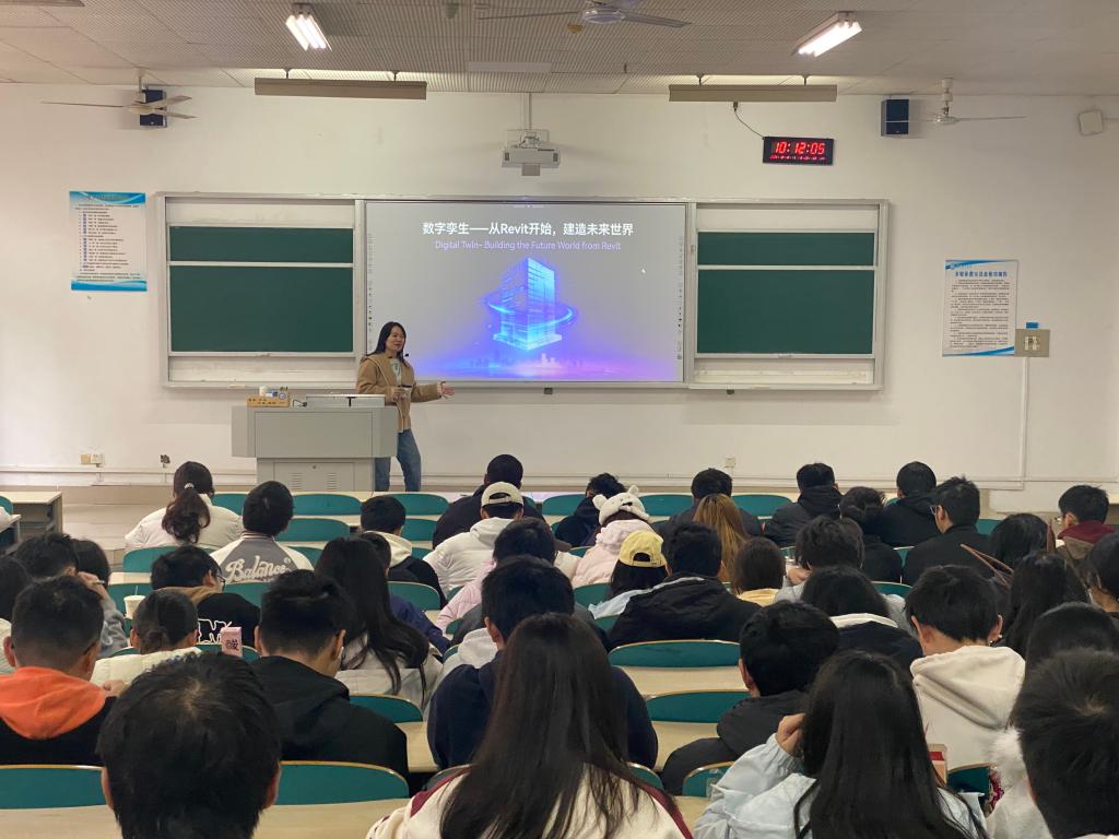 12月12日上午,水利与海洋工程学院教师汪进婷在云塘校区综合教学楼A-105教室开展题为《数字孪生:从Revit开始,建造未来世界》的讲座,学院2025级给排水科学与工程专业学生到场学习。