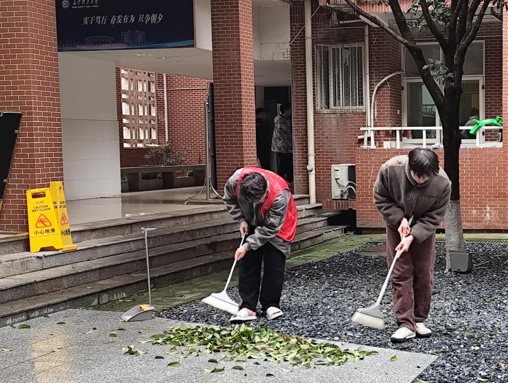 本次活动主要聚焦于学生生活区及育人阵地的环境提升,重点对行健轩一栋、行健轩六栋等宿舍楼周边区域以及学院“大禹之子”一站式育人社区庭院进行集中清扫与维护。同学们在辅导员和班委的组织下分工协作、配合默契,手持扫帚、抹布、垃圾钳等工具,认真擦拭门窗玻璃、规整自行车摆放、捡拾路面杂物、清理卫生死角。大家干劲十足、精神饱满,不放过任何一个角落,不怕脏、不怕累,以细致入微的劳动让责任区域焕然一新,展现出水利学子积极向上的精神风貌。