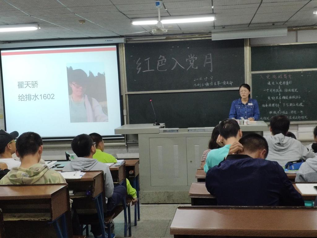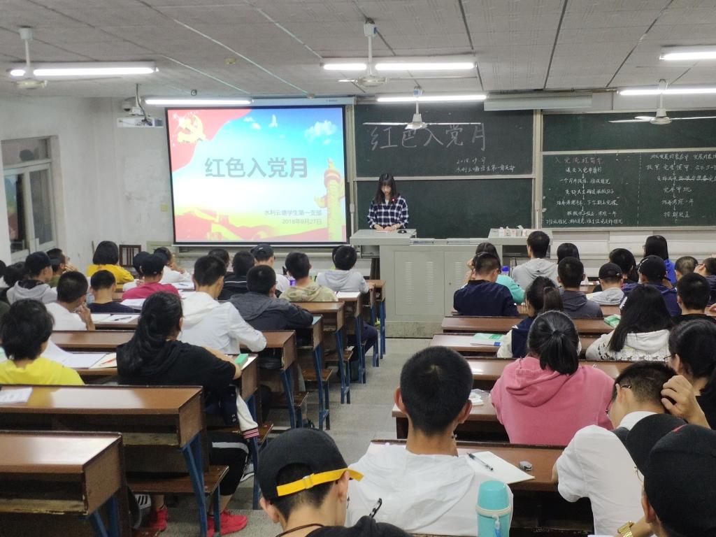 2018年9月27日,为了充分发挥学生党员在优化学风校风、创建和谐校园中的先锋模仿作用,激励新生以优秀学生党员为榜样,努力学习,奋发向上,积极向党组织靠拢,水利云塘学生第一党支部在金盆岭12教116举行了新学期第一次党日活动。会议由唐维婕同志主持,水利云塘学生第一党支部全体成员以及18级水电所有同学参加此次活动。