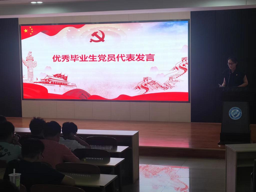 全体与会人员观看视频《本色》,学习老党员朱再保同志投身守护一江碧水和生态文明建设的先进事迹。优秀毕业生党员代表唐佳发言,她回顾了在大学的成长历程,号召全体毕业生党员要听党话、跟党走,勇担民族复兴重任;要强本领、求进步,争做时代青年先锋;要肯奋斗、讲奉献,展现水利学子风采。