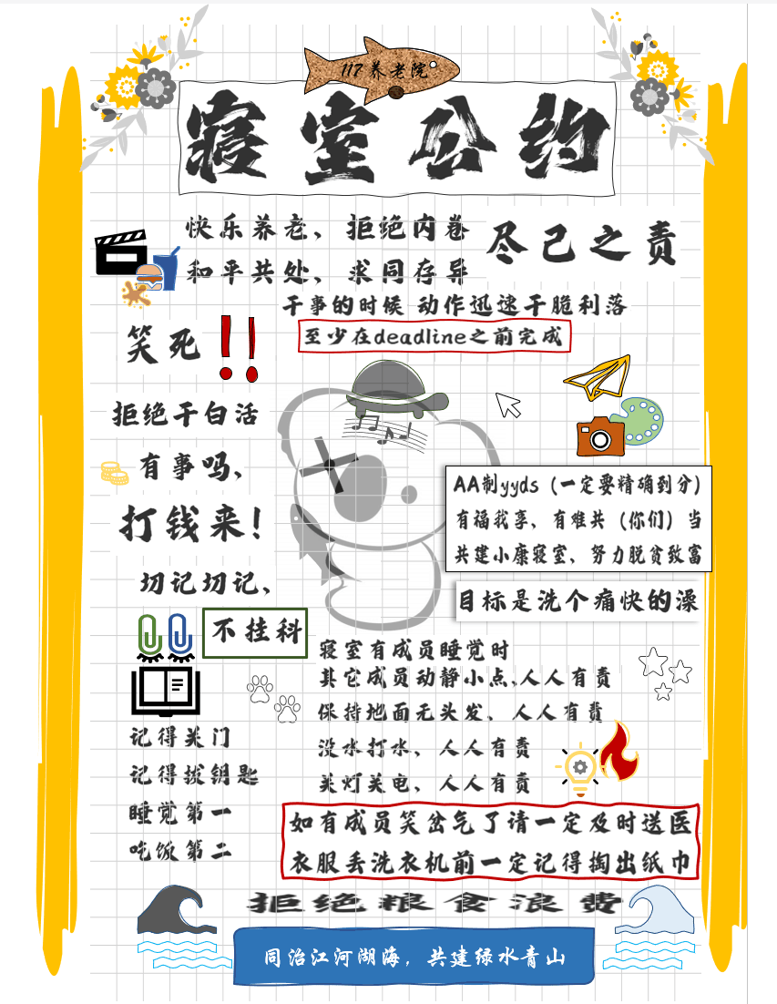 本次寝室公约活动形式丰富多彩,通过图画、文字、图片等多种形式结合的方式展示出了学生们积极向上的精神风貌以及各个寝室的个性风采。在各位同学的精心创作中,体现出了水利学子们对未来寝室集体生活的憧憬,也展现出了新一批“水利人”寝室文明与良好生活作风习惯。