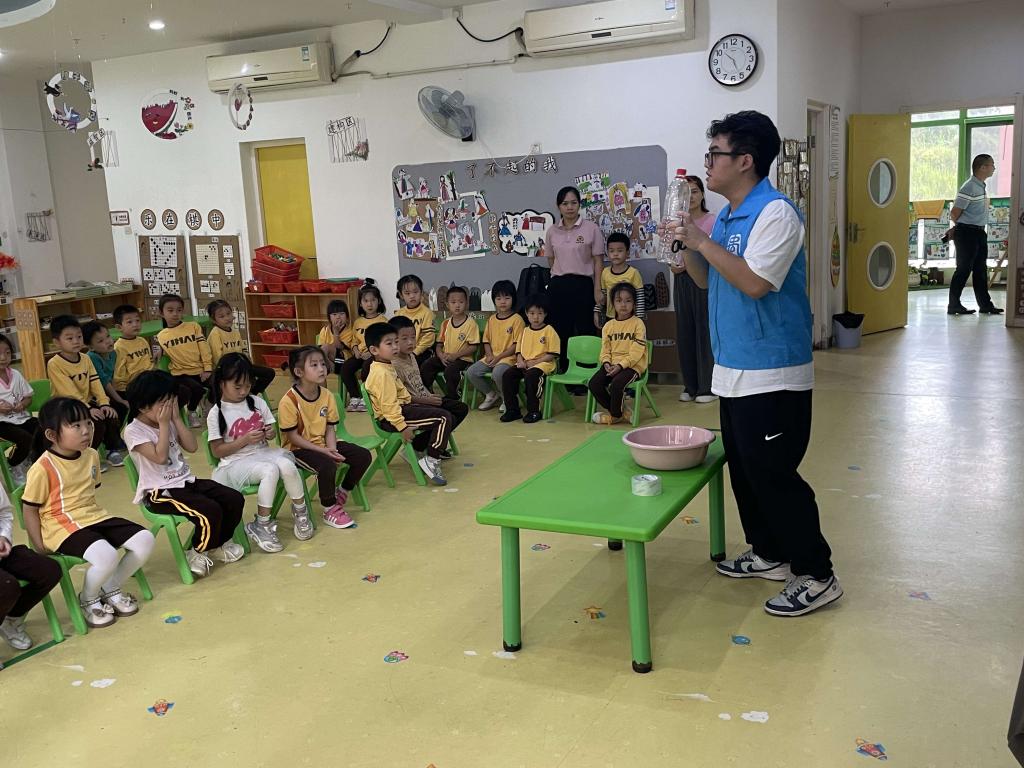 在环保课堂上,志愿者为同学们展示了彩虹桥等与水有关的趣味小实验,小朋友们在寻找到乐趣的同时,对水的重要性和特性进行了学习。