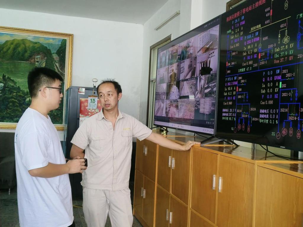 在工作人员的带领下,实践团成员依次参观了电站中的远程值班室、厂房、大坝等场所。在远程值班室中,筷子篓电站站长蓝智勇为实践团成员细致地讲解了水电站的运转原理,并科普了一些水电站监测的小知识。