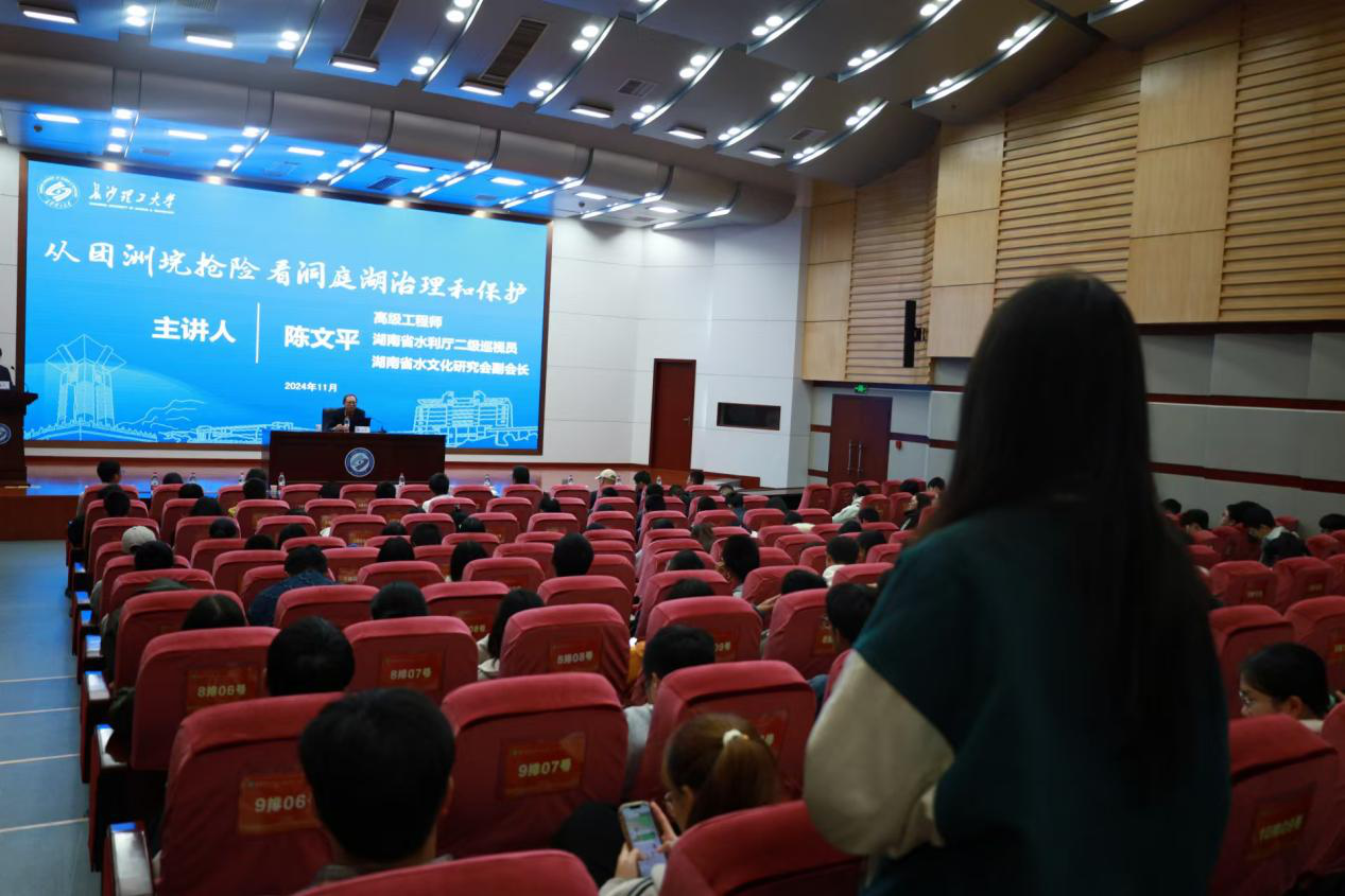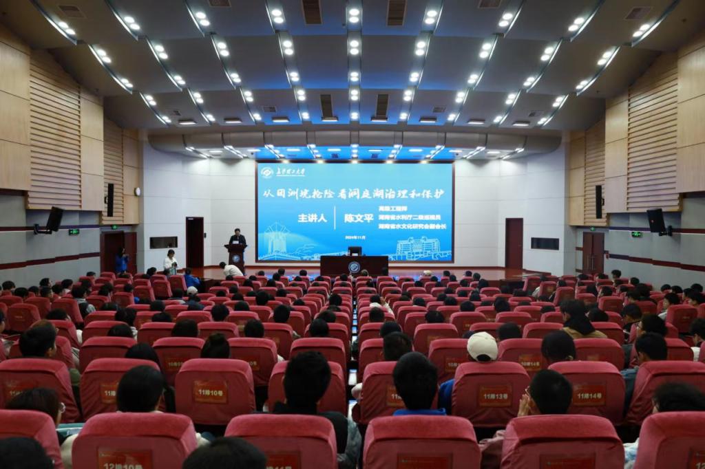2024年11月19号下午,水利与环境工程学院于图书馆报告厅举行了“从团洲垸抢险看洞庭湖治理和保护”专题报告会。本次报告会特邀高级工程师、湖南省水利厅二级巡视员、湖南省水文化研究会副会长陈文平进行授课。水利学院青马班学员以及观众共计260名。此次报告会由水利与环境工程学院院长陈杰主持。