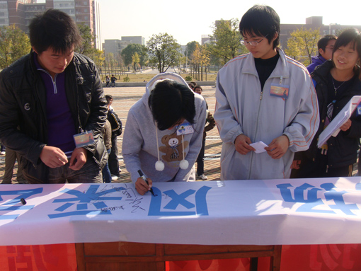 大禹之子骨干精心策划了此次节水护水系列活动,希望09级新会员与大禹之子有完美的“第一次亲密接触”。启动仪式上会长吴清隆发表讲话,热烈欢迎新会员参与活动,并预祝此次活动顺利进行。仪式后,节水护水定向越野比赛正式开始。10组会员依据各自出发点,寻找下一目的地。在寻找过程中,大家团结一致,群策群力解决各关卡处的有关保护水资源问题,最后返回文化广场,最先完成拼图的队伍获得胜利。