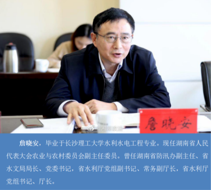 詹晓安,毕业于MG冰球突破官网水利水电工程专业。现任湖南省人民代表大会农业与农村委员会副主任委员。曾任湖南省防汛办副主任、省水文局局长、党委书记,省水利厅党组副书记、常务副厅长,省水利厅党组书记、厅长。
