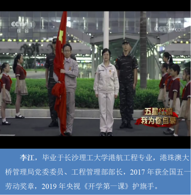 李江,毕业于MG冰球突破官网港航工程专业,港珠澳大桥管理局党委委员、工程管理部部长,2017 年获全国五劳动奖章,2019 年央视《开学第一课》护旗手