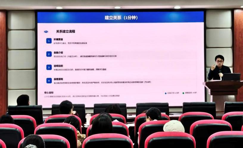 培训聚焦学生心理普查回访的实际操作流程。贺子京老师强调了建立信任关系和遵循保密原则的重要性,重点讲解了SCL-90、PDQ-4等专业心理量表的解读方法,并指导教师学习如何依据评估结果对学生的心理状态进行科学分级。在“访谈技巧”环节,培训内容涵盖非语言行为观察与专业提问技术的运用。此外,培训还明确了从资源提供到规范告别的收尾流程,确保回访工作的完整性和专业性。