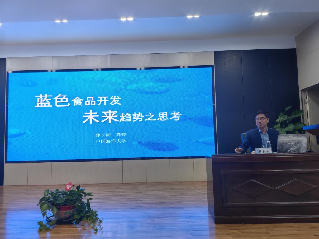 报告会上,薛院士强调,多年来我国食品领域的关注点多放在陆地上,然而海洋能给人类提供的食物是陆地的1000倍,并以水产品是开发功能性营养健康食品和生物制品的重要资源为引子,引发全体师生对海洋生物资源高效开发利用的深入思考。随后,薛院士以自身经历感悟为基础,结合其渊博的学识,先后以大宗水产资源中蛋白质、糖类及脂质的绿色加工为例,深入讲解了海水鱼、鲟鱼籽、海参、南极磷虾、小龙虾等大宗水产品和远洋战略性资源的开发利用现状和未来发展趋势。在讲解过程中,薛院士结合自身对蓝色海洋食品的认识,与师生们一同展望了蓝色海洋食品在服务国家海洋战略中的“着力点”,鼓励师生们要树立远大的科学理想,在挑战和沉淀中积累专业知识和技能,努力将个人发展同国家需求紧密联系在一起。