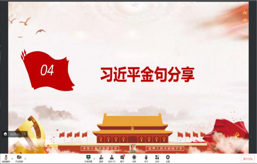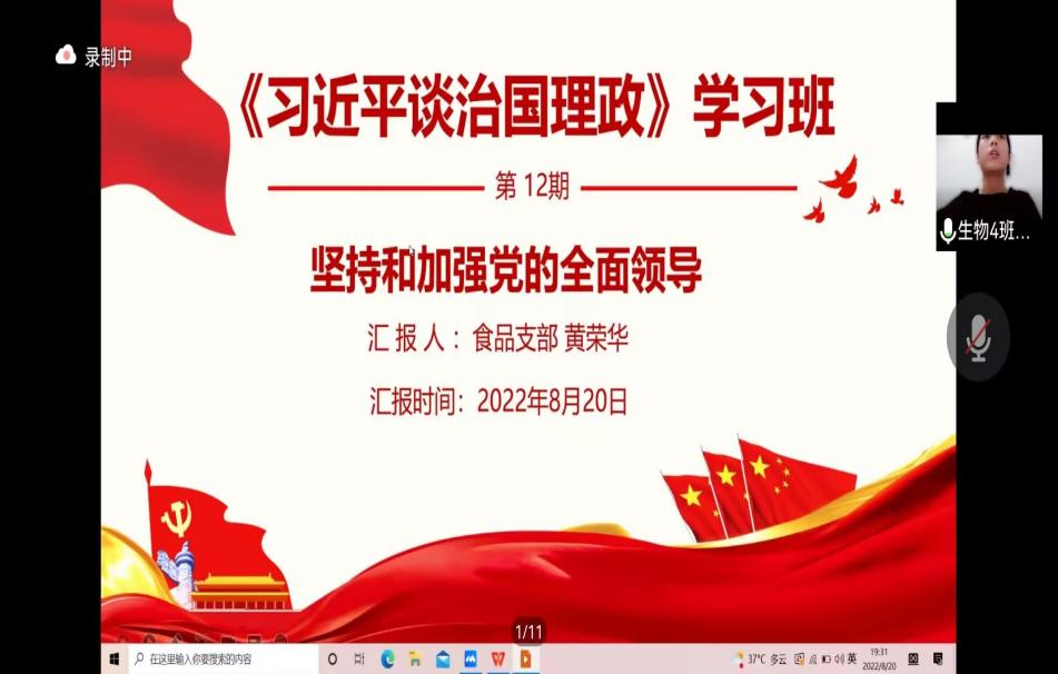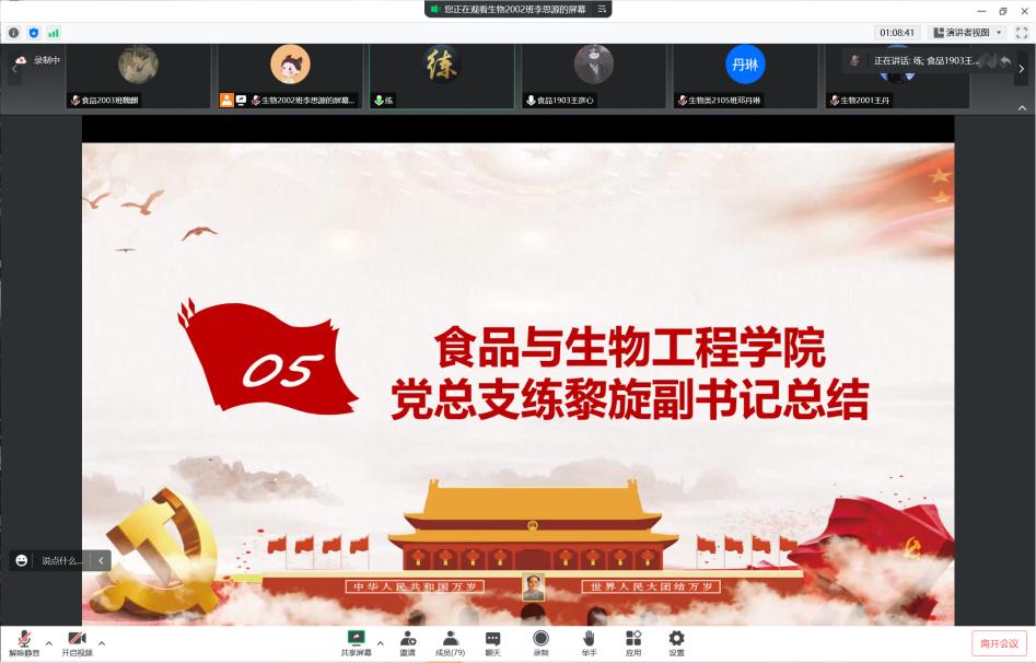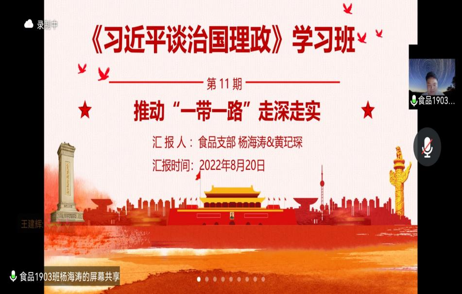 2022年8月20日,MG冰球突破官网食品与生物工程学院食品本科生党支部在腾讯会议举办《习近平谈治国理政》读书班第六次读书分享会。食品学院党总支书记王建辉、党总支副书记练黎旋、学工办老师胡佳佳等师生近100余人参加此次活动。