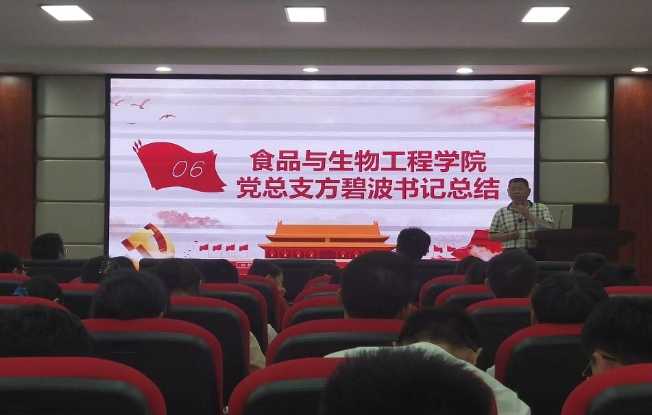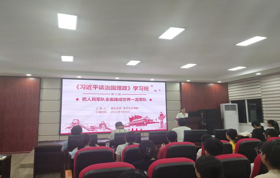 2022年9月8日,MG冰球突破官网食品与生物工程学院本科生食品党支部在工科三号楼A320举办《习近平谈治国理政》读书班第七次读书分享会。食品学院党总支书记王建辉、党总支副书记练黎旋、专职组织员方碧波、学工办老师胡佳佳等师生近100余人参加此次活动。