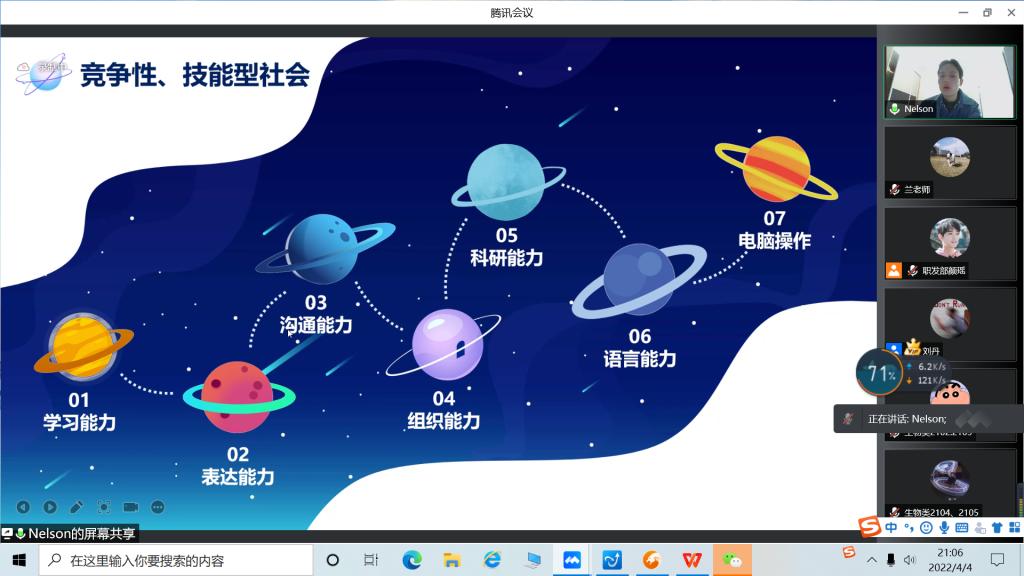为进一步加强学院学生职业认知能力和规划水平,帮助学生认识专业及未来发展,树立正确的求职目标,4月4日晚19:30,食品学院以线上形式举行了以“青春献礼二十大,强国有我新征程”为主题的职业与人生大讲堂活动,此次活动由就业辅导员兰贵辉主持,学院2014级优秀校友刘涛作为嘉宾进行了专题分享,学院2021级新生在自习教室集体观看,其他年级学生及研究生自主线上参与,共计近400人参加。