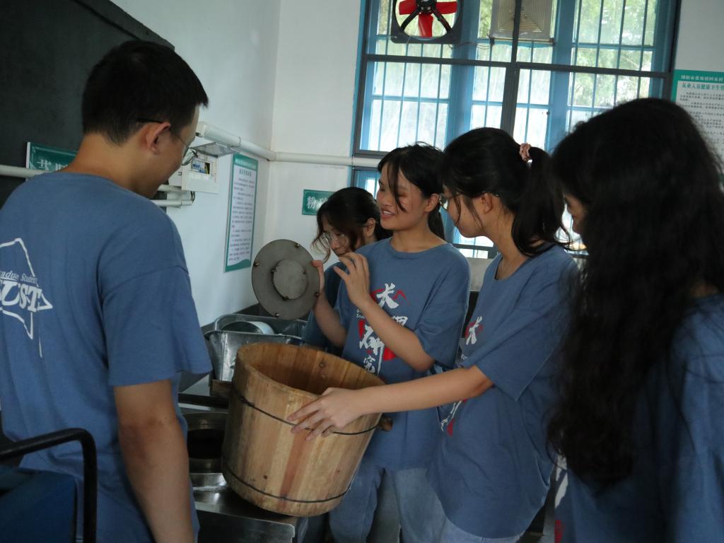 随后,实践团成员自行探索生产设备的结构和工作原理,化身工艺讲解员。实践团成员食品2003班蒋明芳在介绍蒸胚机时说:“这个蒸胚机的结构体现了设计人员的三个智慧,一个是桶中的不锈钢网做成半球形是为了增大受热面积和传热效果,第二个是不锈钢隔板的设计是为了防止液态水分进入原料中,第三个是水箱中的浮球,是为了控制蒸胚机中水位的高度。”大家都对这些微小但是重要的设计赞不绝口。在指导老师吴苏喜教授的指导和协助下,实践团将油茶籽倒入粉碎机粉碎,在蒸胚机里蒸熟,然后转移到制饼机将初油挤压出来。在看到金灿灿的茶油从制饼机溢出来时,每个人的成就感油然而生,然后将油装瓶,以便后期将油带回学校实验室,进行质量指标检测和后期离心去杂工艺处理。