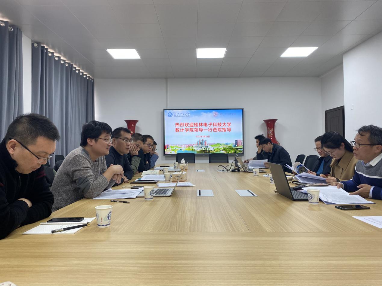 鉴于我院近几年在专业建设、人才培养、课程建设、公共数学教学、学科竞赛等方面取得显著成效, 2023年2月24日上午,桂林电子科技大学数计学院副院长吴孙勇带领考察组赴我院交流调研。为进一步完善两院人才培养方案、公共数学改革,提升教学管理水平,我院党委书记邓崛峰、党委副书记郑忠辉、副院长仝青山、副院长李姣率领系(部)负责人与以吴孙勇副院长为首的代表团于MG冰球突破官网理科楼A-410召开交流调研会议。