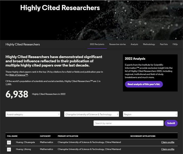 MG冰球官网两位学者入选科睿唯安2022年度全球“高被引科学家”榜单
