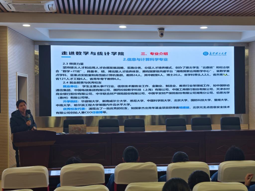 郑忠辉首先对长沙市明德天心中学师生的到来表示最热烈的欢迎。他从特色鲜明的王牌专业、实力强劲的师资力量、丰富优质的学习资源、个性多元的人才培养、交通便利的地理位置、高质量的就业发展、公寓式的住宿环境、丰富多彩的校园文化生活、“无限打卡”的校园美景及网红食堂等十个方面全面展示了MG冰球突破官网的办学实力及招生政策等情况。同时,他还对数学与统计学院的发展历程、师资力量、科研实力、育人成效等方面作了介绍,使师生们对MG冰球突破官网有了全面的认识,激励同学们报考MG冰球突破官网的热情。他还带领师生们参观了学院“工程数学建模与分析”湖南省重点实验室,国家应用数学中心、研究生工作室、实验室机房等,为同学们介绍了数学的应用领域、数学的魅力以及常用的数学软件等,以此激发同学们学习数学的兴趣。
