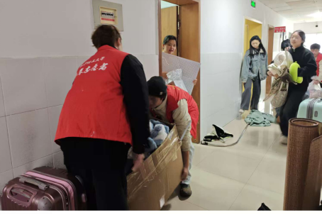 整个过程中,年级和班级学生骨干展现了高度的责任心与执行力,不仅率先垂范、带头行动,更积极协调同楼层、同班级同学,确保了搬迁流程衔接顺畅、忙而不乱。尤为亮眼的是,由各年级志愿者组成的服务队伍活跃在搬迁一线。他们主动担当,热情服务,穿梭于各楼栋与楼层之间,不辞辛劳地协助同学搬运大件行李、指引最佳路线、协助物品归整,极大地提升了搬迁效率,也传递了浓厚的同窗情谊与团队温暖。年级辅导员龚丁、邓文杰全程深入搬迁工作现场,在弘毅轩1栋、3栋和4栋各寝室逐间走访巡查,细致了解每位同学的搬迁进度与实际困难,现场及时协调解决各类突发问题,并反复叮嘱同学们注意人身与财物安全,爱护公共设施,鼓励大家尽快适应新环境。
