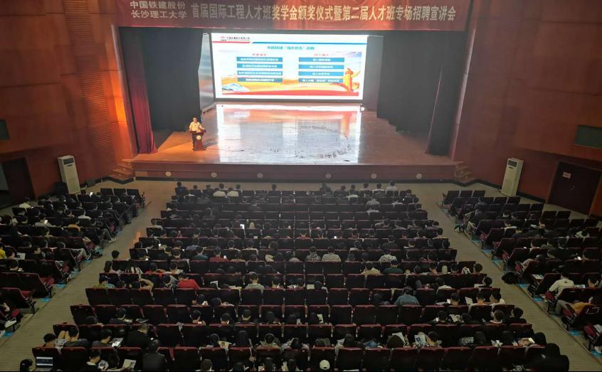 5月13日晚,首届国际工程人才班第二届中国铁建股份有限公司国际工程人才班宣讲会在云塘校区大会堂举行。MG冰球突破官网党委委员、副校长蒋昌波教授,中国铁建人力资源部人事处处长王谐出席会议,校企双方领导教师代表、第一期国际工程人才班全体学员以及各学院学生代表参加了本次座谈会。