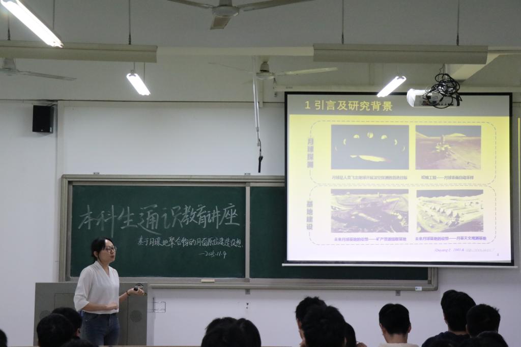11月4日晚,土木学院于云塘校区文科楼E301开展了主题为“基于月壤地聚合物的月面原位建造设想”的通识教育讲座,特邀建工系熊归砚博士主讲,共有100余名本科生参加讲座。