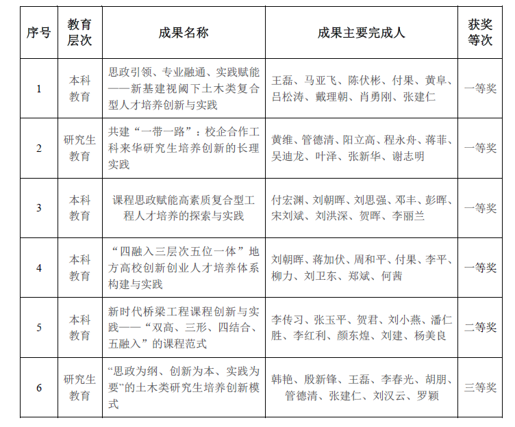 湖南省教育厅公布了《关于公布第十三届湖南省高等教育教学成果奖获奖项目的通知》(湘教通﹝2022﹞130号),我院被授予省级高等教育教学成果奖6项,包括一等奖4项、二等奖1项、三等奖1项。王磊教授主持获省级高等教育教学成果一等奖1项,管德清教授、彭晖教授、付果副教授参与获省级高等教育教学成果一等奖各1项,李传习教授主持获省级高等教育教学成果二等奖1项,韩艳教授主持获省级高等教育教学成果三等奖1项。