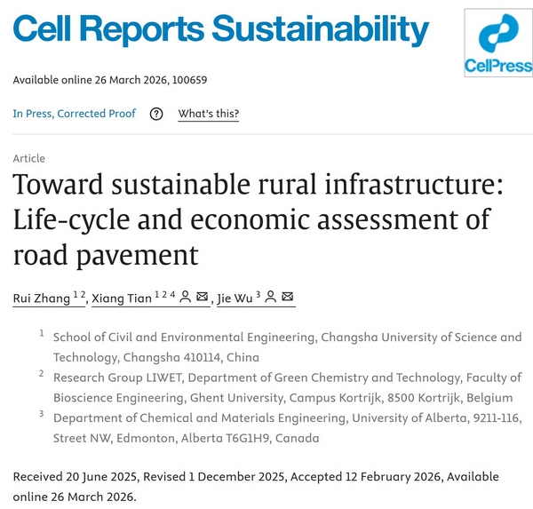 近日,我院青年教师田湘与合作者以MG冰球突破官网为第一完成单位在《Cell》子刊《Cell Reports Sustainability》发表学术论文“Toward sustainable rural infrastructure: Life-cycle and economic assessment of road pavement”。该期刊创刊于2024年1月,专注于可持续发展领域的高质量跨学科研究,是全球可持续发展研究的旗舰期刊之一。