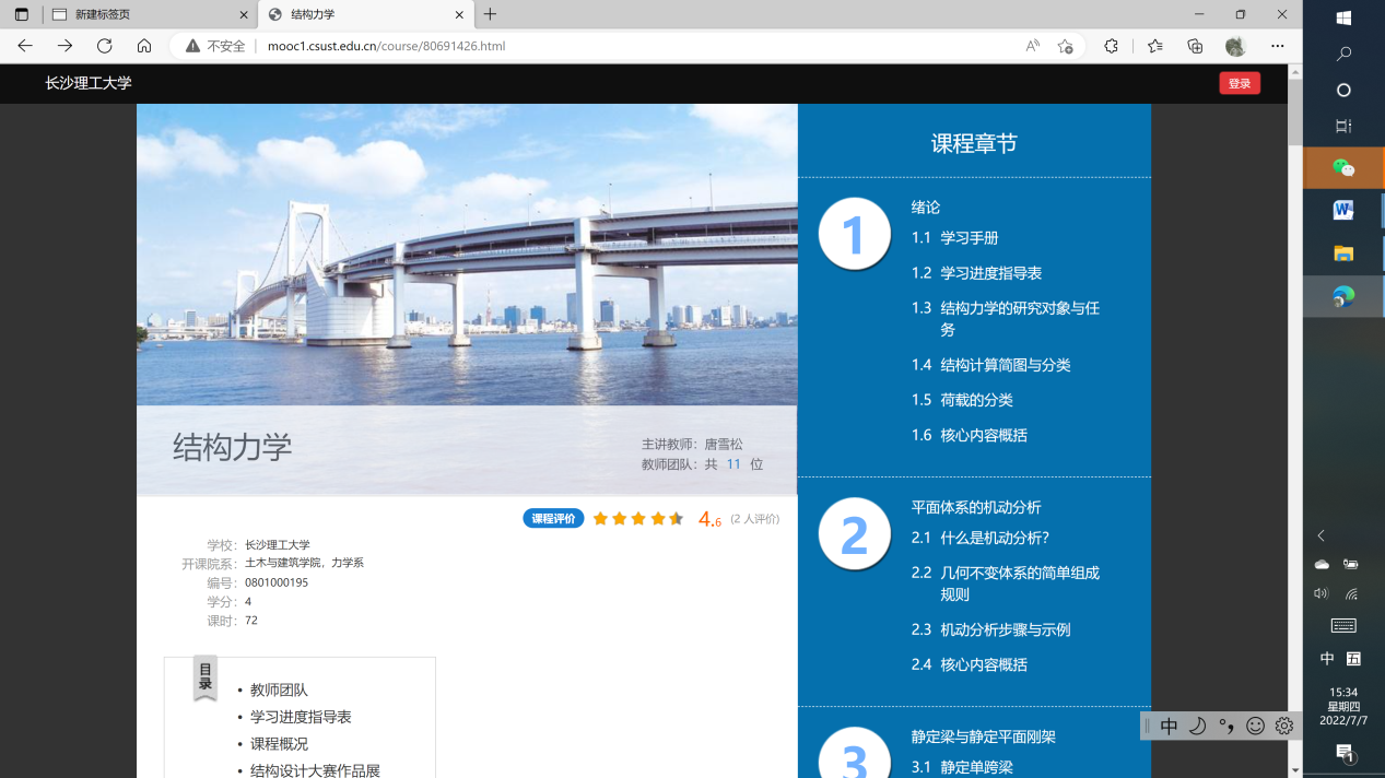 结构力学课程,2014年成为MG冰球突破官网首门建成并投入使用的慕课课程,2018年成为门批湖南省精品在线开放课程。