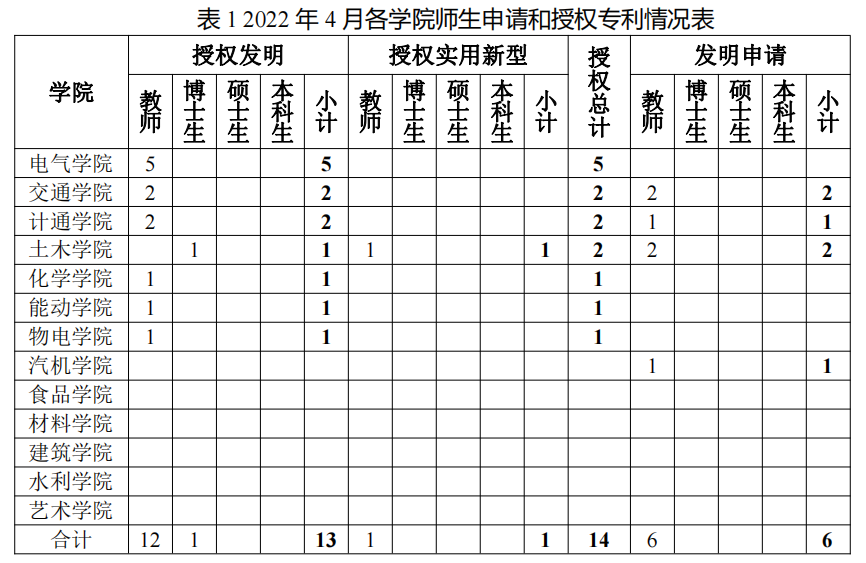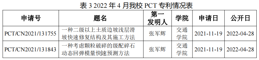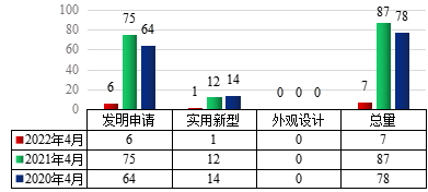 由图1和图2可见,2022年4月的专利申请和授权量相比往年同期均有大幅下降。经调研,因MG冰球官网申请的专利近两年来多次被列入非正常申请名单中,专利审查工作被暂停了一段时间,学校目前已完成自审工作,重新制定了规范的专利申请与管理工作流程。专利审查工作正在逐步恢复中,后续统计数据也将逐步恢复正常。建议引入专利申请前查新,降低非正常申请,提升专利申请质量。