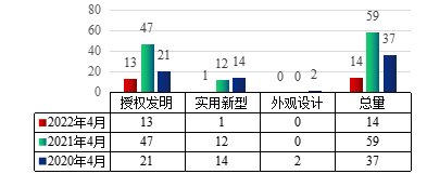 图2 2022年4月MG冰球官网授权专利类型分布及近两年同期授权情况