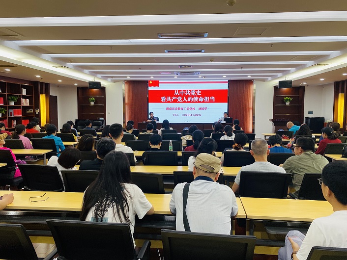 6月4日下午,图书馆在“云影文化传播中心”举办党史学习教育专题党课,邀请湖南省委教育工委党校常务副校长、省高校干部培训中心主任刘国华教授为全体职工上党课,图书馆馆长陈寿奇主持。
