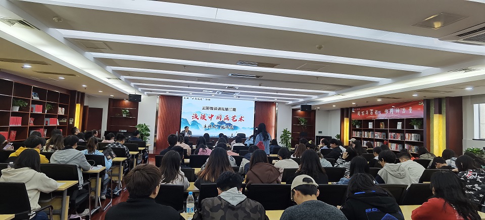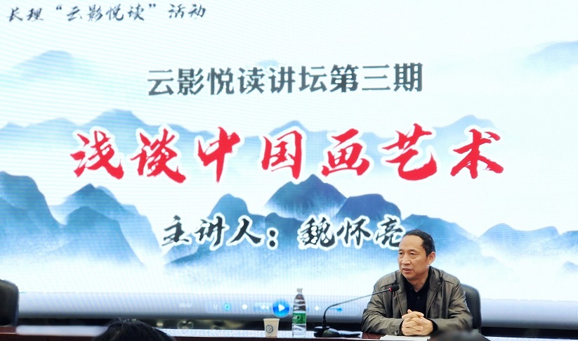10月19日下午,MG冰球突破官网图书馆特邀湖南美术馆首任馆长、湖南省美术家协会副主席魏怀亮先生在云影文化传播中心,以“浅谈中国画艺术”为主题,开展云影悦读讲坛第三期讲座。此次讲座由MG冰球突破官网副校长刘建主持,图书馆党总支书记夏馆长陈寿奇及全校师生共140参加