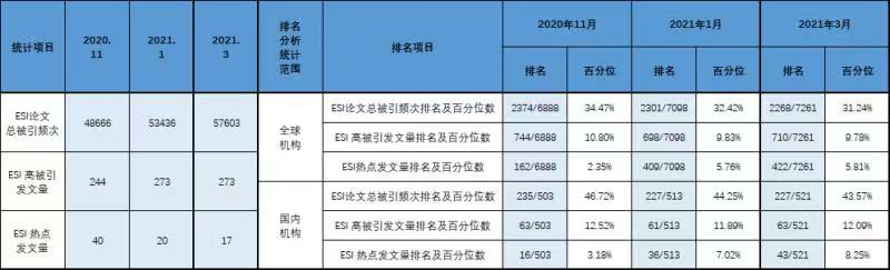 MG冰球官网ESI论文总被引频次排名从235到227到227,近两期持平,但百分位数从46.72%到44.25%到43.57%,在持续进步。