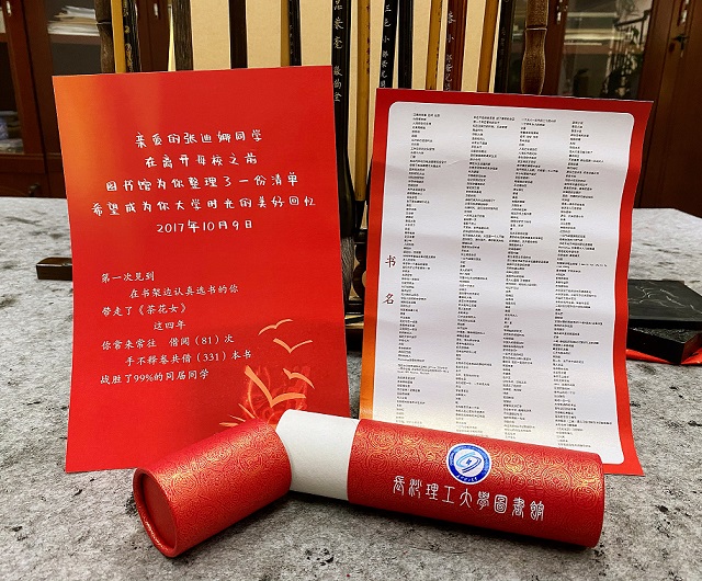 图书馆从六千多毕业生中统计出四年借阅量全校排名前二十名的同学,把阅读清单装进精美的礼盒送出。第一名材料学院的张迪娜同学,四年里阅读了331本书,平均每年八十多本。图书馆还将在近期举办颁奖仪式,表彰并奖励排名前二十名的同学