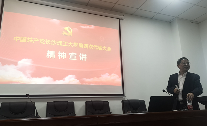 然后阐述了大会的主要精神:确立“一个目标”暨决胜建成“百强”大学;分“两步走”战略,第一步:从现在到2025年,是建成“百强”大学的决胜期。第二步:在此基础上再奋斗10年,到2035年全面建成创新型高水平大学,实现“百强”大学梦。打造“三个基地”:特色人才培养重要基地、湖南科技创新重要源头、文创和湖湘文化国际传播前沿阵地。实现“四个发展”:特色发展、创新发展、协调发展、共同发展。明确“五个坚持”:坚持育人为本、坚持人才集聚、坚持交叉创新、坚持服务融合、坚持文化引领。建设“五个长理”:“笃信长理”、“先锋长理”、“担当长理”、“清廉长理”、“幸福长理”。